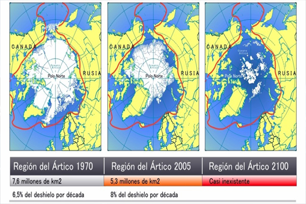 El derretimiento del polo ártico es un asunto muy importante, muchos científicos han sacado la conclusión que en esta década a subido el nivel del mar, lo que sería lo mismo que entre unos 10 y 25 centímetros. Muchos científicos han verificado que la subida del nivel del mar es causada por la fusión (es el cambio en el que el agua pasa de estar en estado sólido a líquido) del polo ártico.Groenlandia contribuye con un 28% al total de subida del nivel del océano ya registrada, mientras que a la fusión de hielos antárticos corresponde otro 12%. Muchos científicos habían estimado que el derretimiento que están sufriendo esas dos grandes plataformas cubiertas de hielo supondrían el 60% del agua extra que se incorpora al mar.La causa es porque a aumentado el nivel global de dióxido de carbono en la atmósfera, debido a la quema de combustibles fósiles como el carbón, el petróleo, o el gas natural..., la radiación infrarroja(es una de los tipos de luz que emite el sol) que se emite como consecuencia de que la superficie terrestre se calienta por los rayos solares, no puede escapar por tanto, y una parte se queda retenida por este exceso de CO2. La conclusión es que la temperatura global de la tierra ha aumentado y sigue aumentando actualmente.La solución a este problema sería acabar de quemar combustibles fósiles, y emplear otras alternativas como la luz solar...